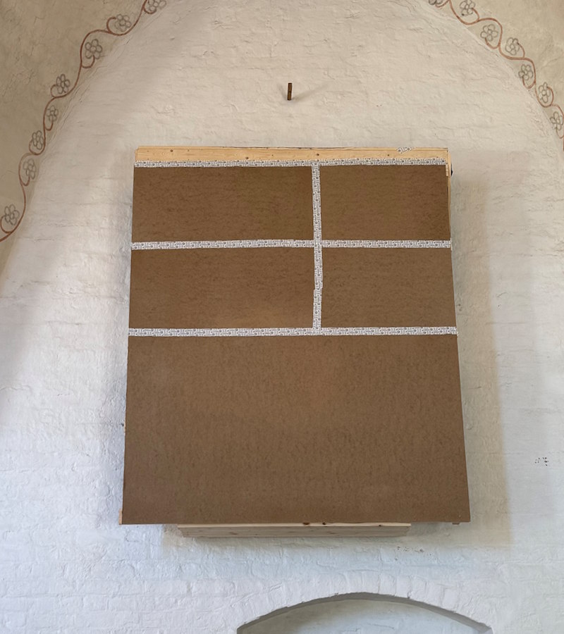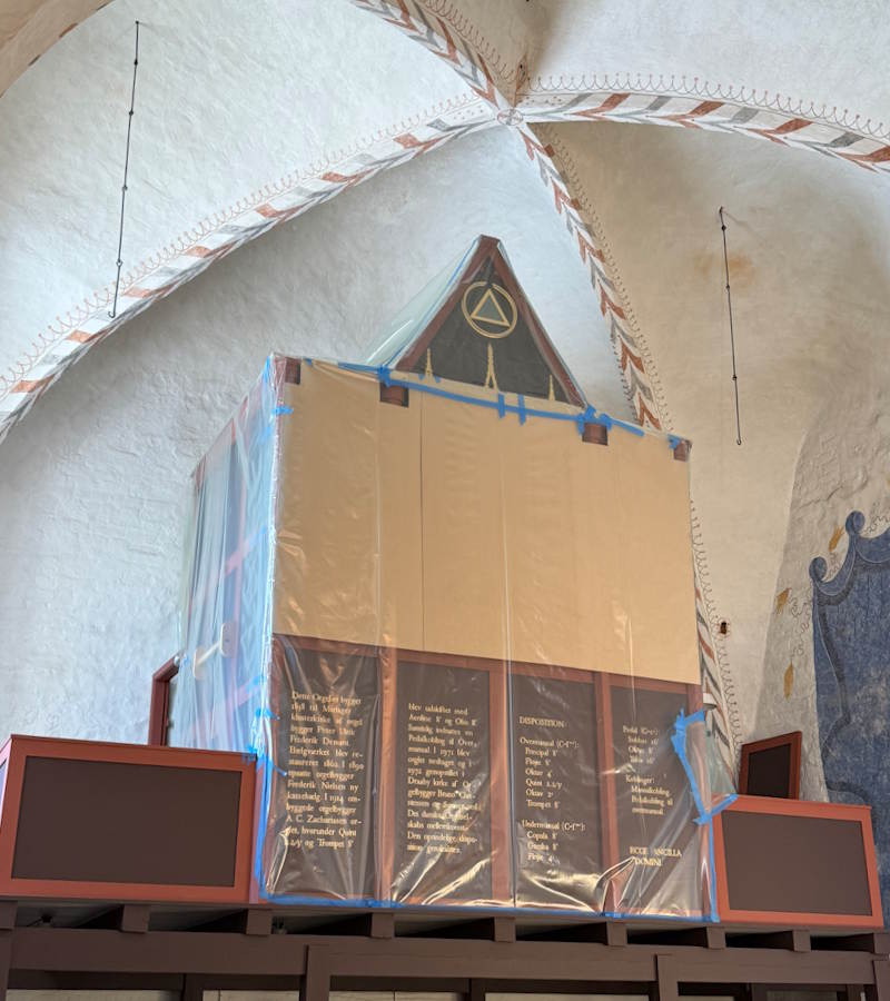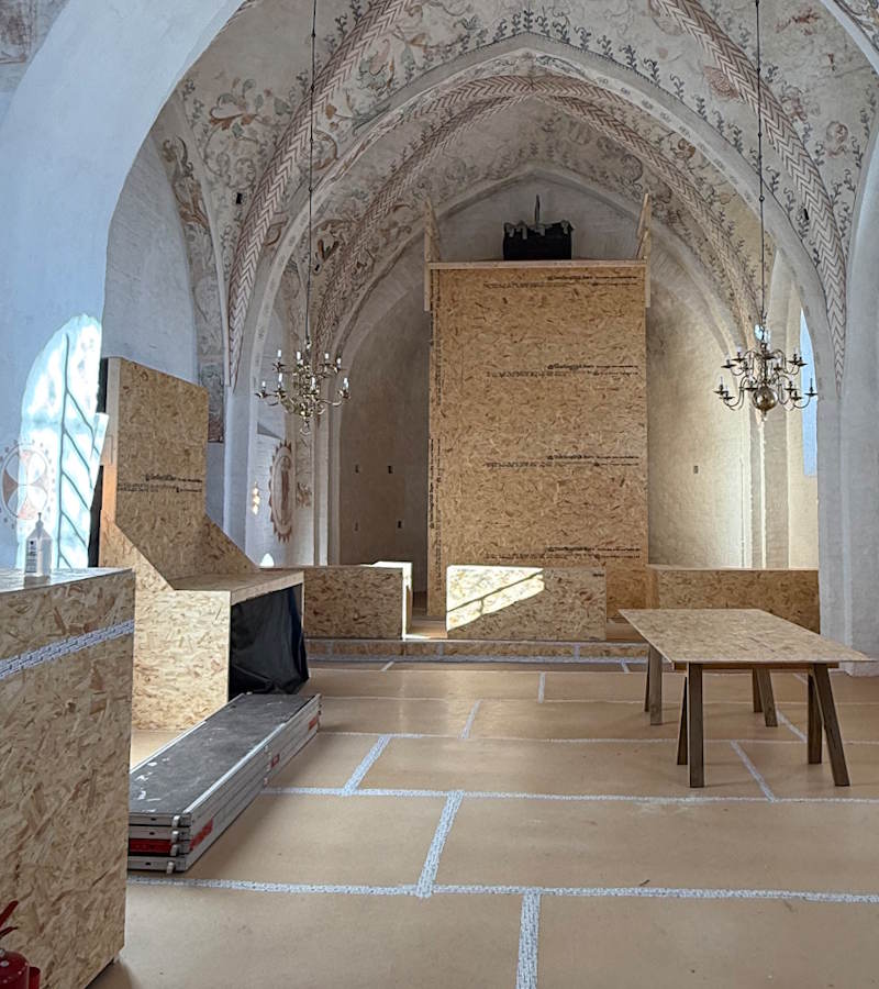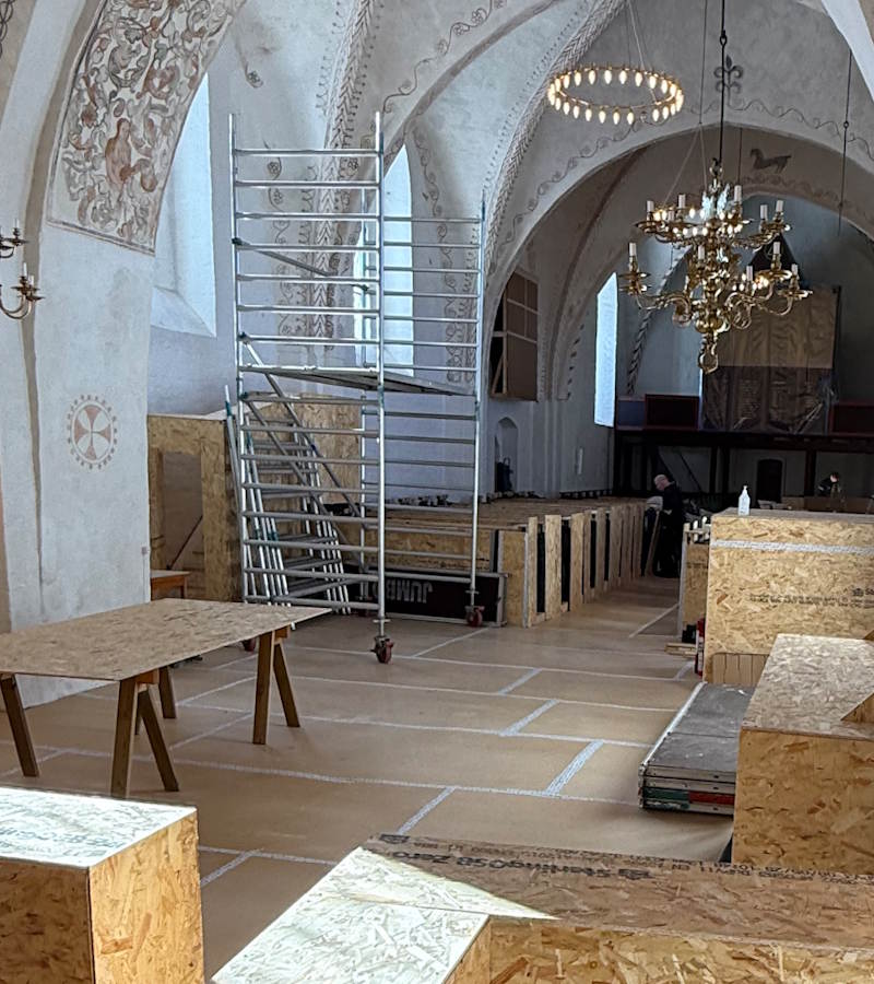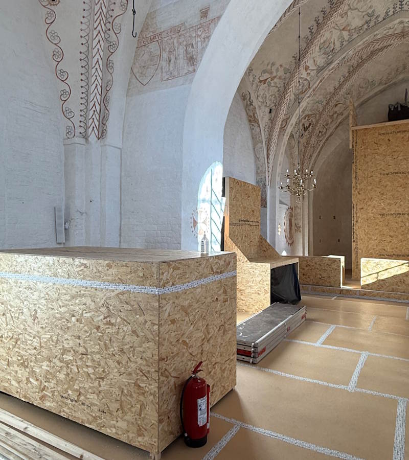 »Vi har haft vores tømrersvend Niels Erik og lærling Mikael som faste kræfter på projektet. Det har taget dem omkring tre uger at afdække alt. På de mest intensive dage har vi haft op til seks mand i gang for at sikre, at alt i kirkerummet blev korrekt beskyttet.«